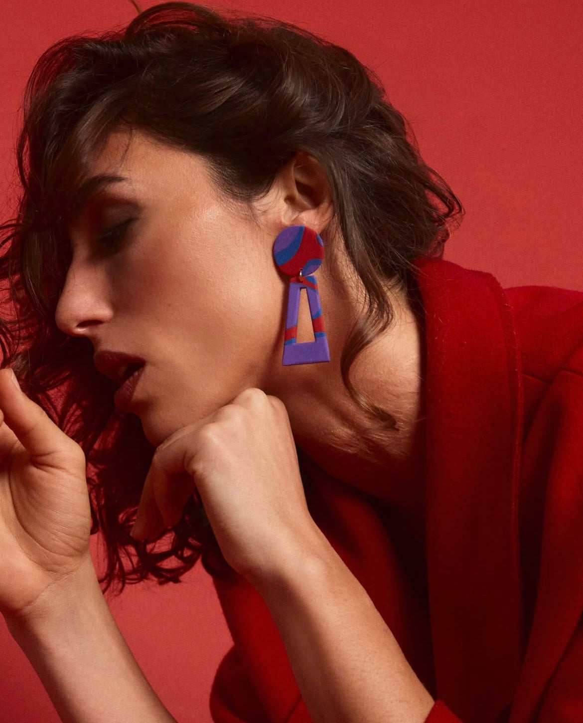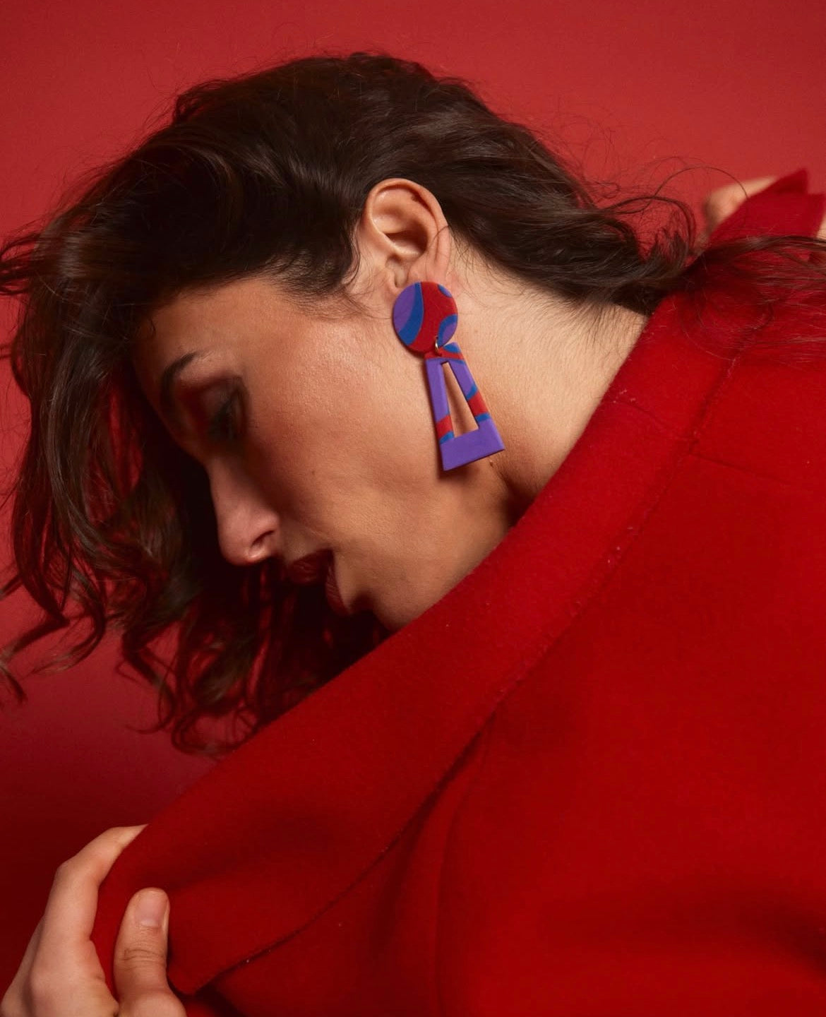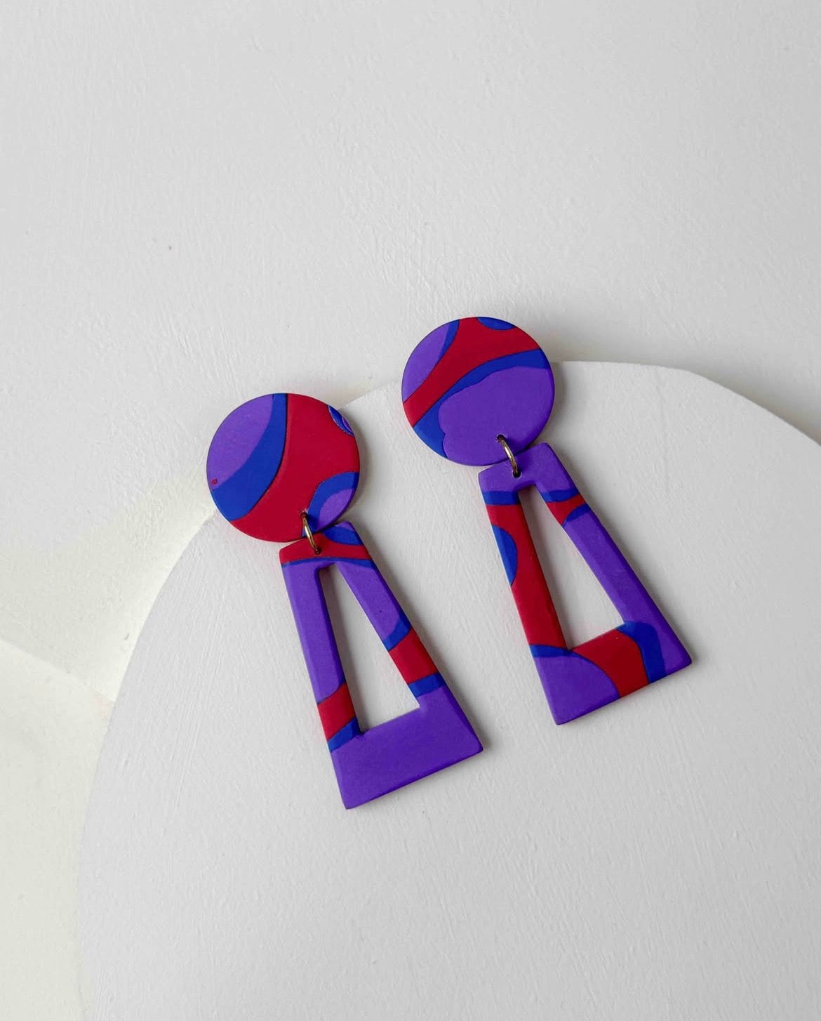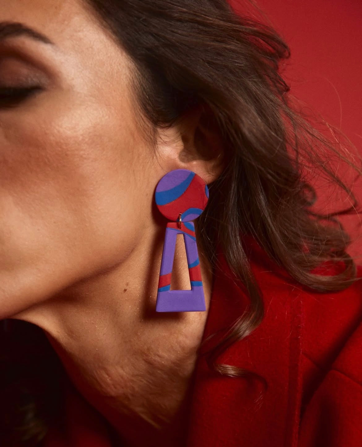 Brincos grandes em padrão vermelho, azul e roxo.